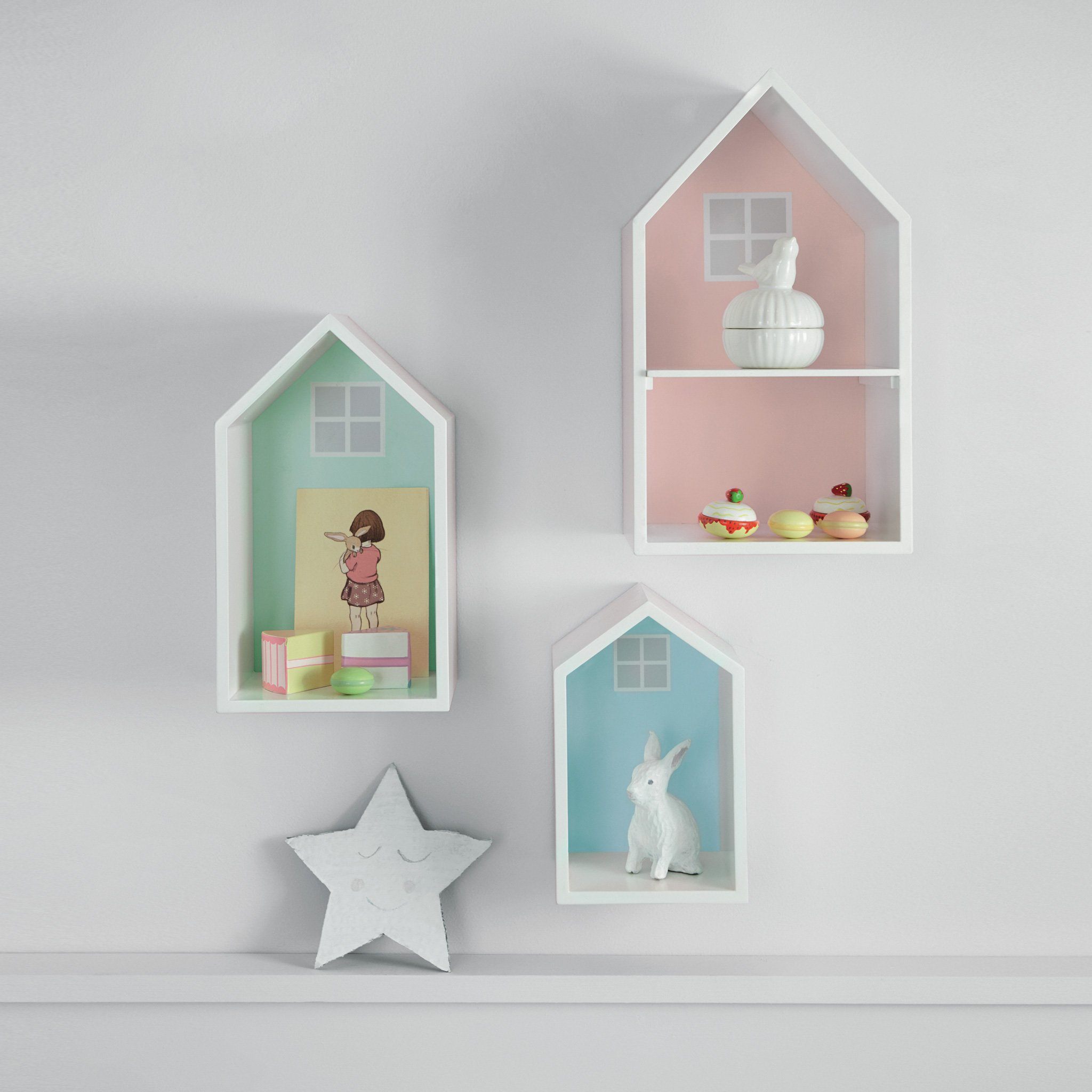 Display treasured toys and memorabilia on these lovely wall shelves; they look as pretty as a picture in their own right. The set includes three Doll's House Shelves: the largest is Shell Pink and includes a removable shelf, the middle sized one is Willow Green, the smallest is Sky Blue. Wall fixings not provided; it's safer and more practical if you buy the fixings required for the particular type of walls in your home.