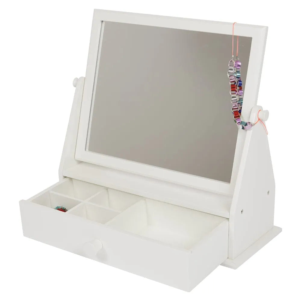 A beautiful addition to a dressing table or desk, this dressing table mirror is designed to encourage children to be a little more independent when it comes to taking care of themselves. The angle of the mirror is easy to adjust, and brushes, hair accessories, jewellery and trinkets can be safely stored within the compartments in the slide-out drawer.