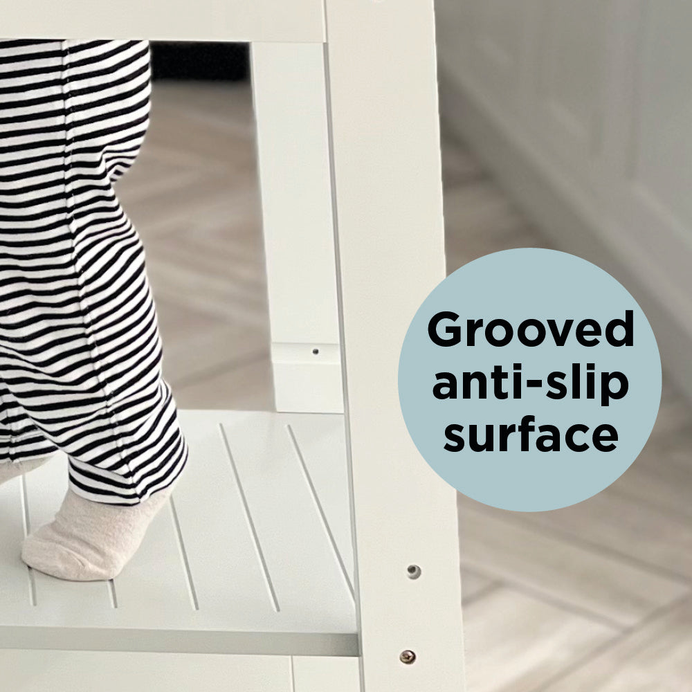 We've made it from solid MDF and thoroughly tested it for safety. The step is adjustable so it can be used as they grow and it has a grooved, anti-slip surface. They'll love the chalk board on the side too; it's great for a bit of pre-dinner doodling.