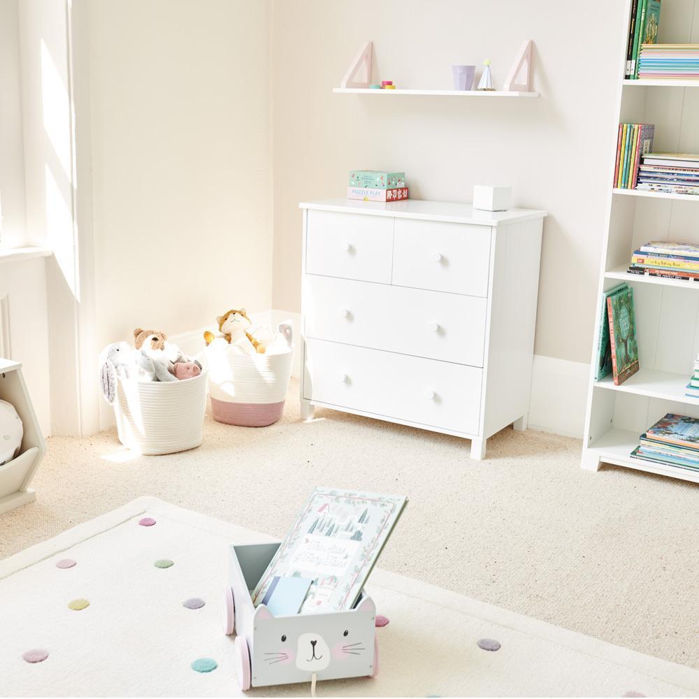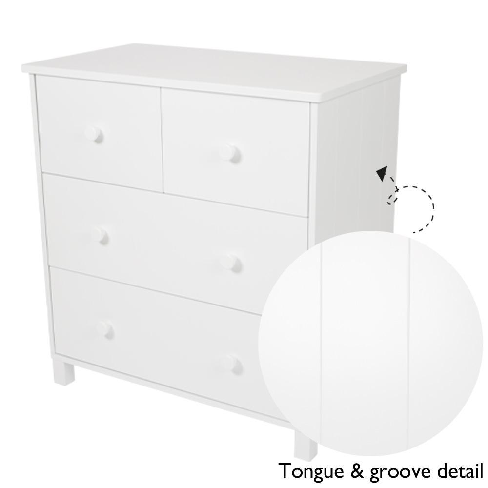 This contemporary chest of drawers not only looks divine, it's also a practical addition to a nursery and guaranteed to last through childhood and beyond. With two small drawers and two large drawers, all on runners for smooth opening and closing, it offers plenty of storage for clothes and blankets.