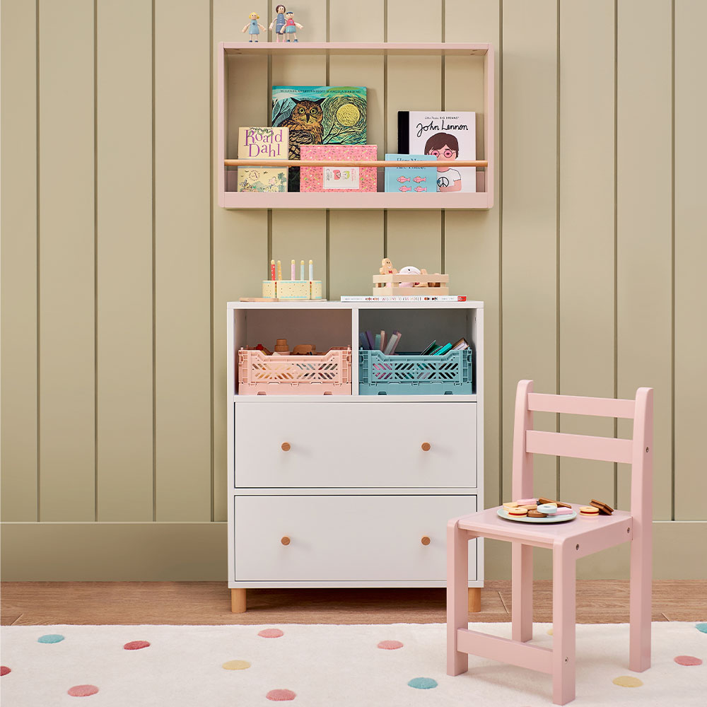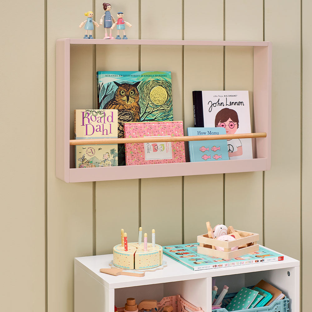 The dusky chalk pink looks beautiful with our range of children's bedroom interiors. Partner the display bookshelf with our pastel collection of children's bedroom accessories.