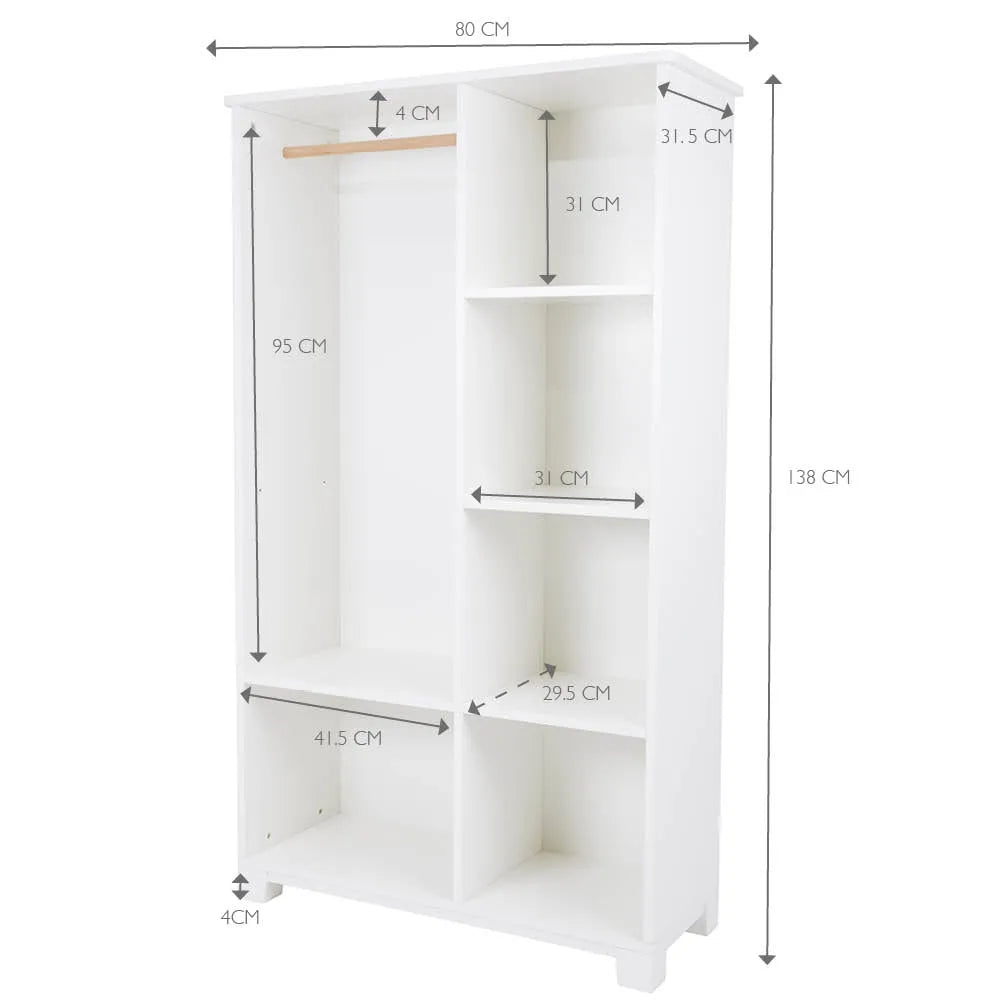 This modern open wardrobe with hanging rail and handy compartments is a really versatile storage option. It's great for babies and toddlers with plenty of space to hang special outfits and store accessories and toys neatly away; remove the adjustable shelf and it's the ideal wardrobe for older children to hang up their clothes. Alternatively, pop it in a playroom and use the rail for dressing up outfits, and the shelves for books, toys and games.