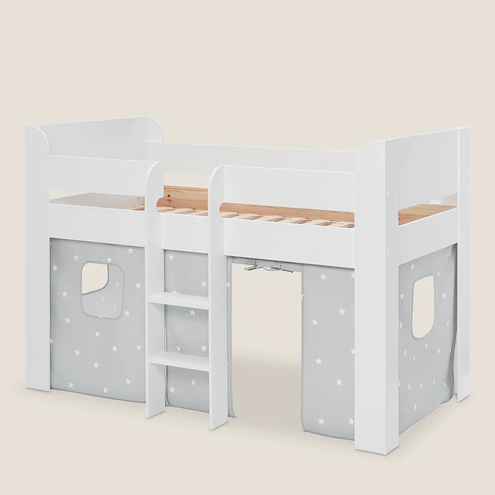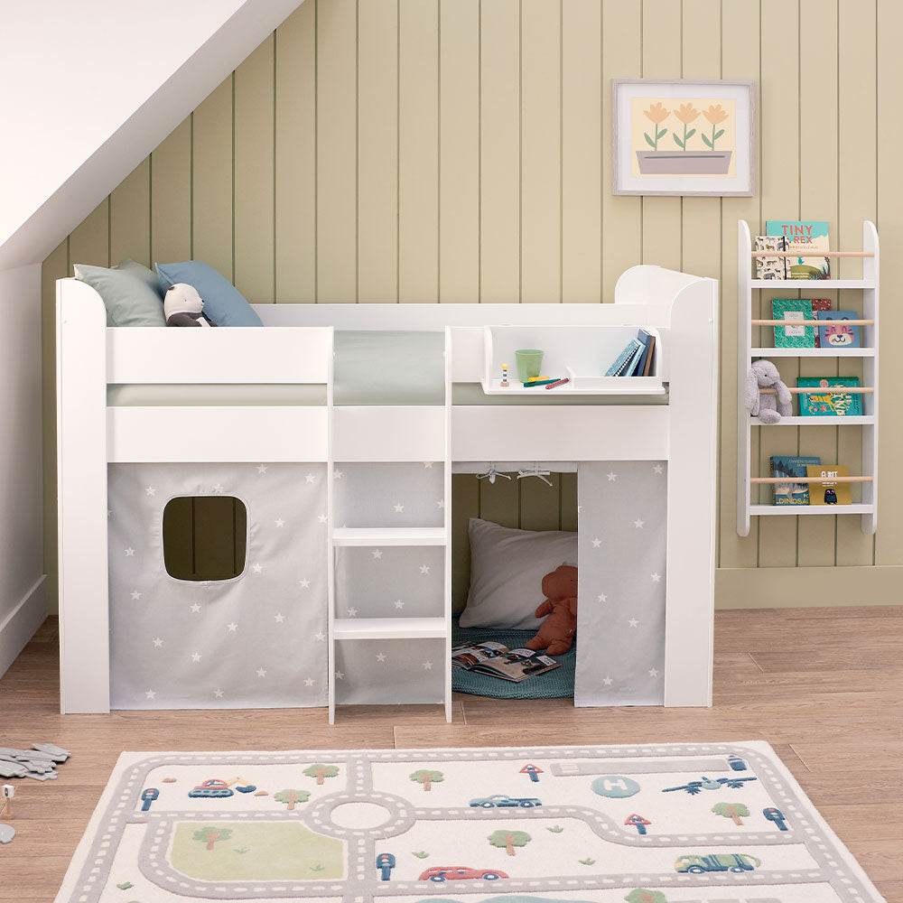 This sturdy kids' midsleeper bed is designed to be a fun but helpful addition to your family! It's also available to buy without bed curtains, but either way you can use the space underneath for play, storage or sleeping bags on sleepovers. The calm grey star curtains work with a range of interiors and bedroom decors providing vesatility and longevity. The Paddington Shelf and Paddington Desk fit underneath and are great partners for this compact bed.
