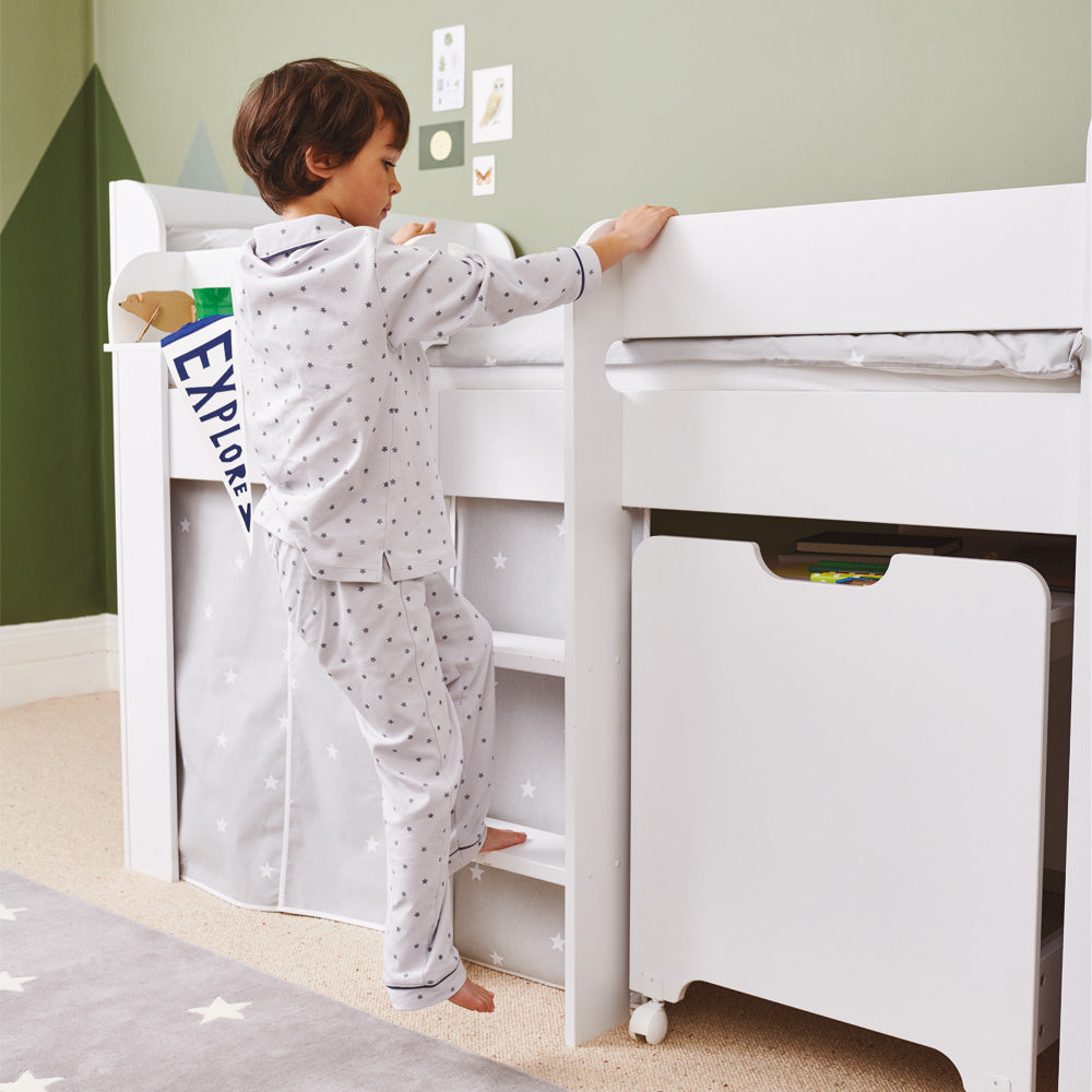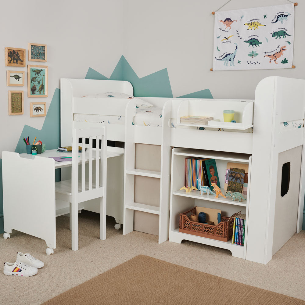 The Paddington Mid Sleeper ranges is suitable for children aged 6 years and older who need a functional study area and cosy sleeping space. We’ve designed the Paddington range for small bedrooms where maximising space is essential, the storage shelf is ideal for books, toys, or baskets, helping to keep the room organised and clutter-free.