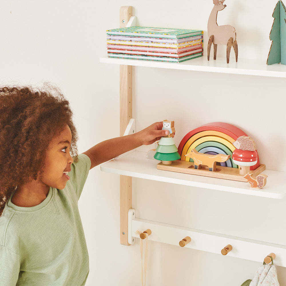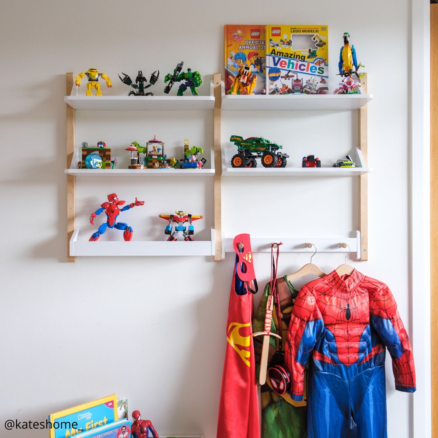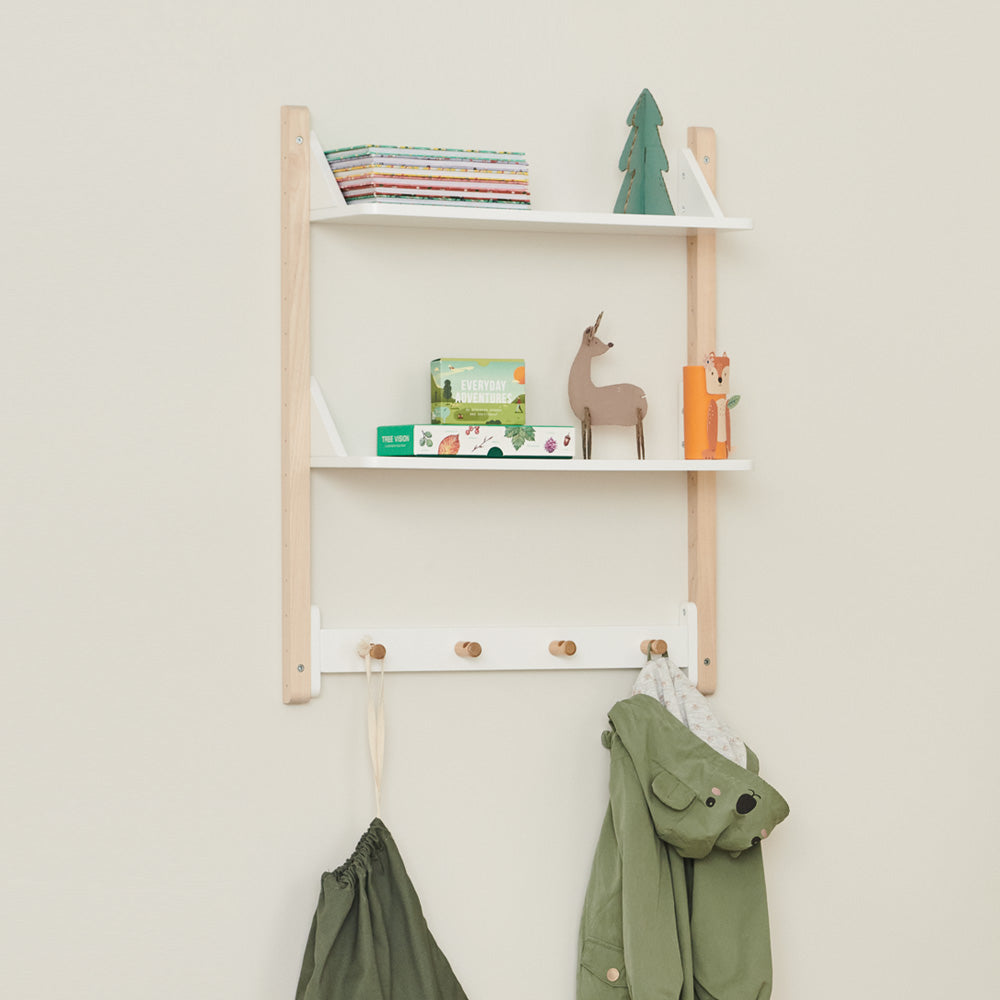 Create a stunning display in bedrooms and playrooms alike whilst also keeping bits and bobs off the floor. This Paxon Modular Shelving set contains two beech wall supports, two MDF shelves and a beech peg rail. Simply place the storage components into the pre-holed wall supports and fix to the wall. Bingo!