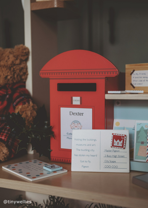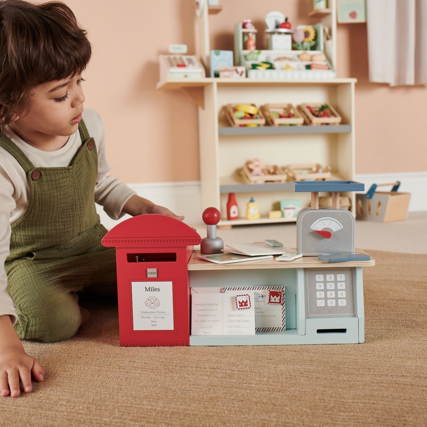 Add your child's name to personalise this charming Toy Post Office. Pop stamps on the letters and postcards and post them through the letterbox; weigh the parcels on the working scales and pop them down the functioning parcel drop; and don't forget your bank card to pay for all the postage.