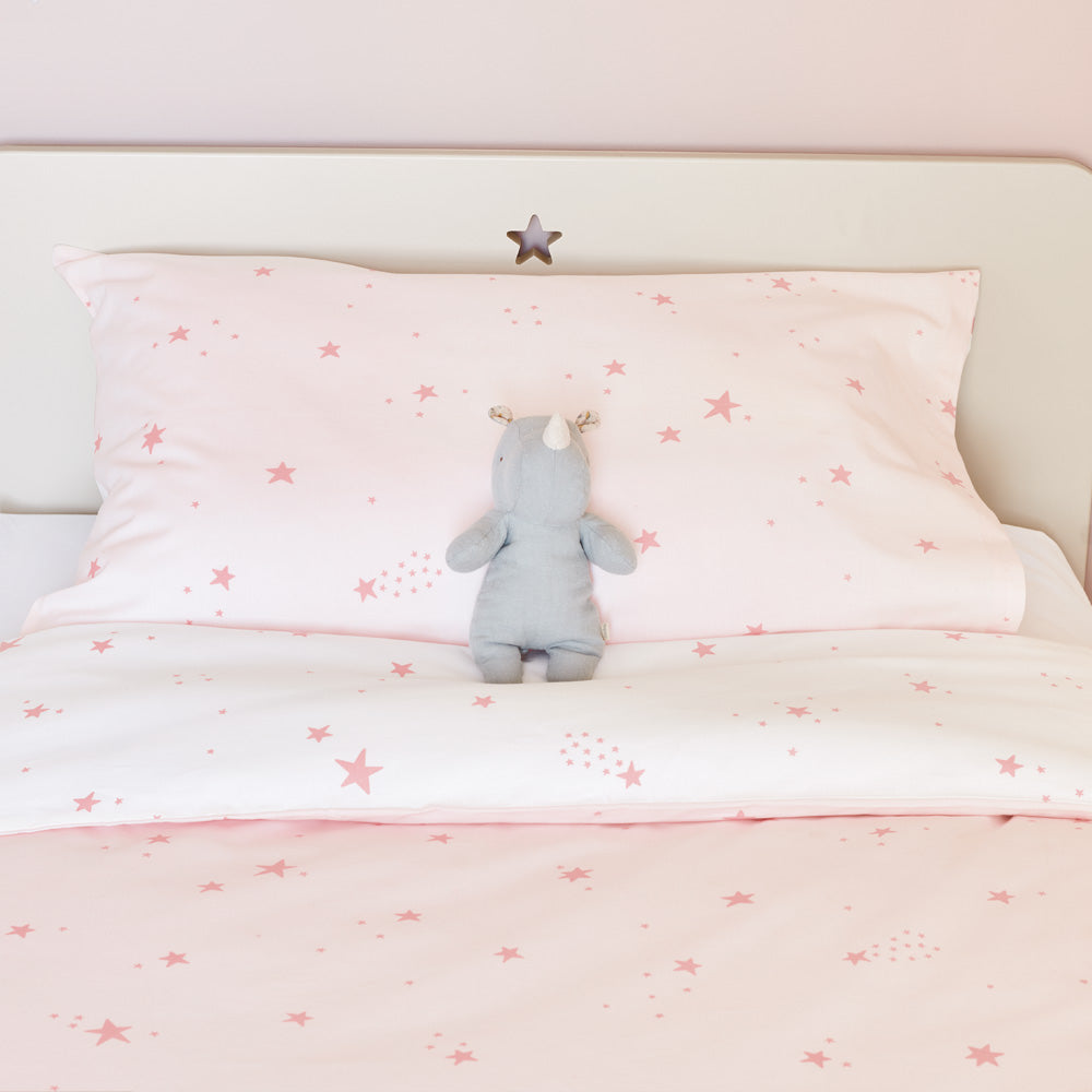 We love the extra sprinkling of stars on this new version of our popular Scattered Stars bedding set. Printed on both sides, this pink set includes a regular size pillowcase and duvet cover with neat button closure. It's made from smooth cotton percale chosen for its naturally cool feel and easy-care properties.