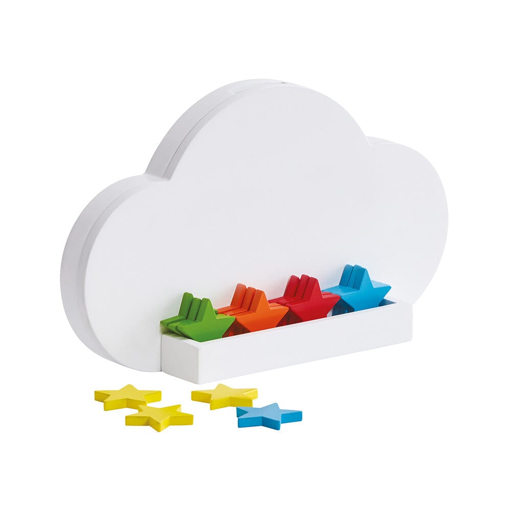 The wooden cloud box has a painted finish and acrylic safety glass. It comes with 16 wooden, multi-coloured stars and has a magnetic closure so once the cloud box is full you can easily get the stars out again. The stars can also be stored in the back compartment.