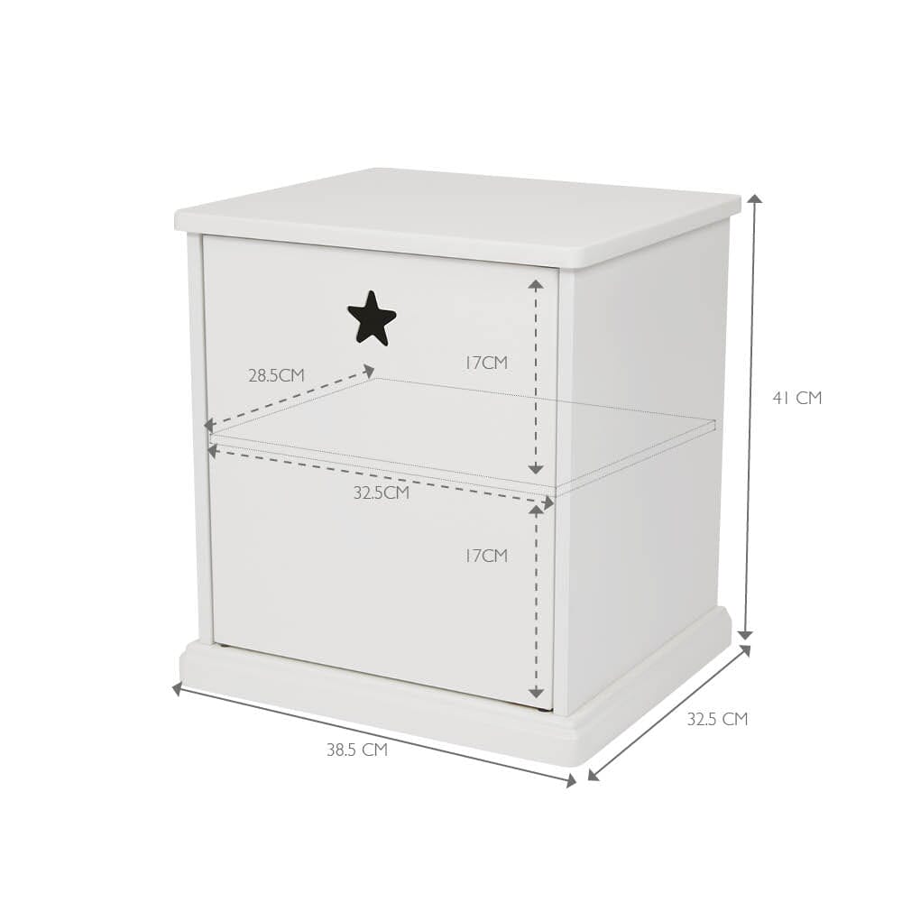 Here's a lovely bedside cupboard for children's bedrooms, with a classy cut-out star and an internal shelf. It's made from MDF and has a Bright White painted finish to withstand the wear and tear of a family home.