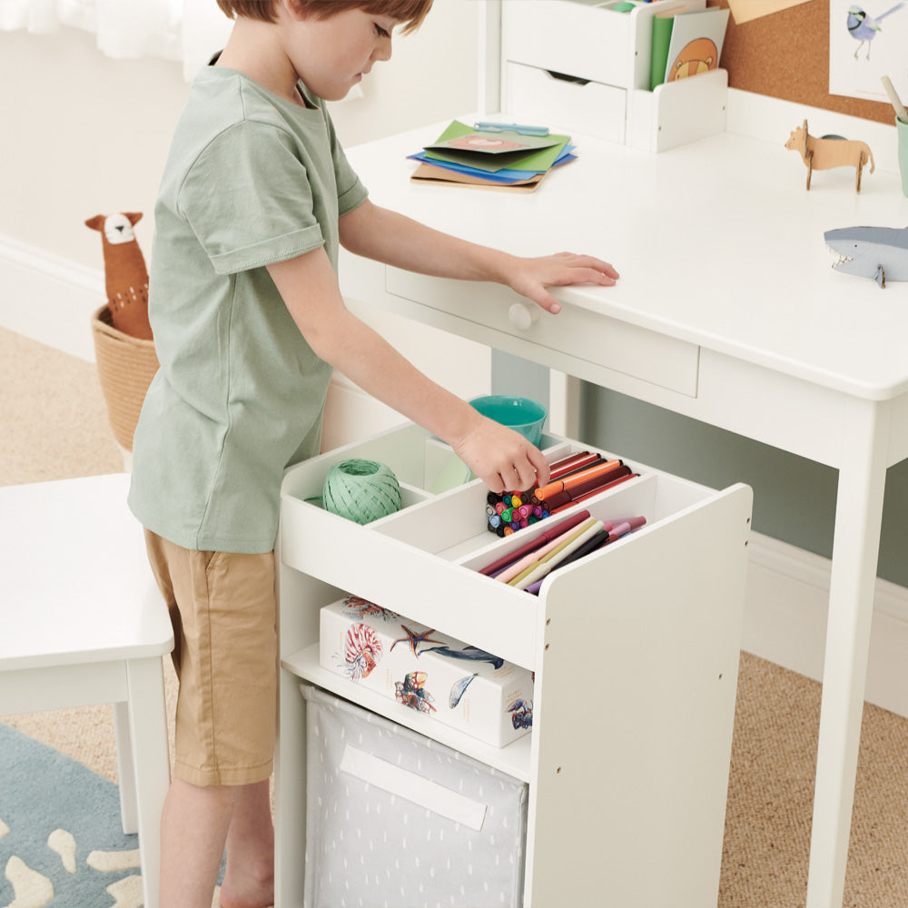 Keep all their stationery and homework essentials in one place with our Under Desk Storage Tower. Our children's desk storage is great for small spaces, it tucks neatly away when not in use and because it's on wheels, it's easy for kids to pull out and put away again. There's a shelf for notepads and workbooks plus a stationery tray and large compartment too. To banish clutter, slide one of our canvas storage cubes into the bottom section; we have so many lovely designs to choose from, why not take a look?