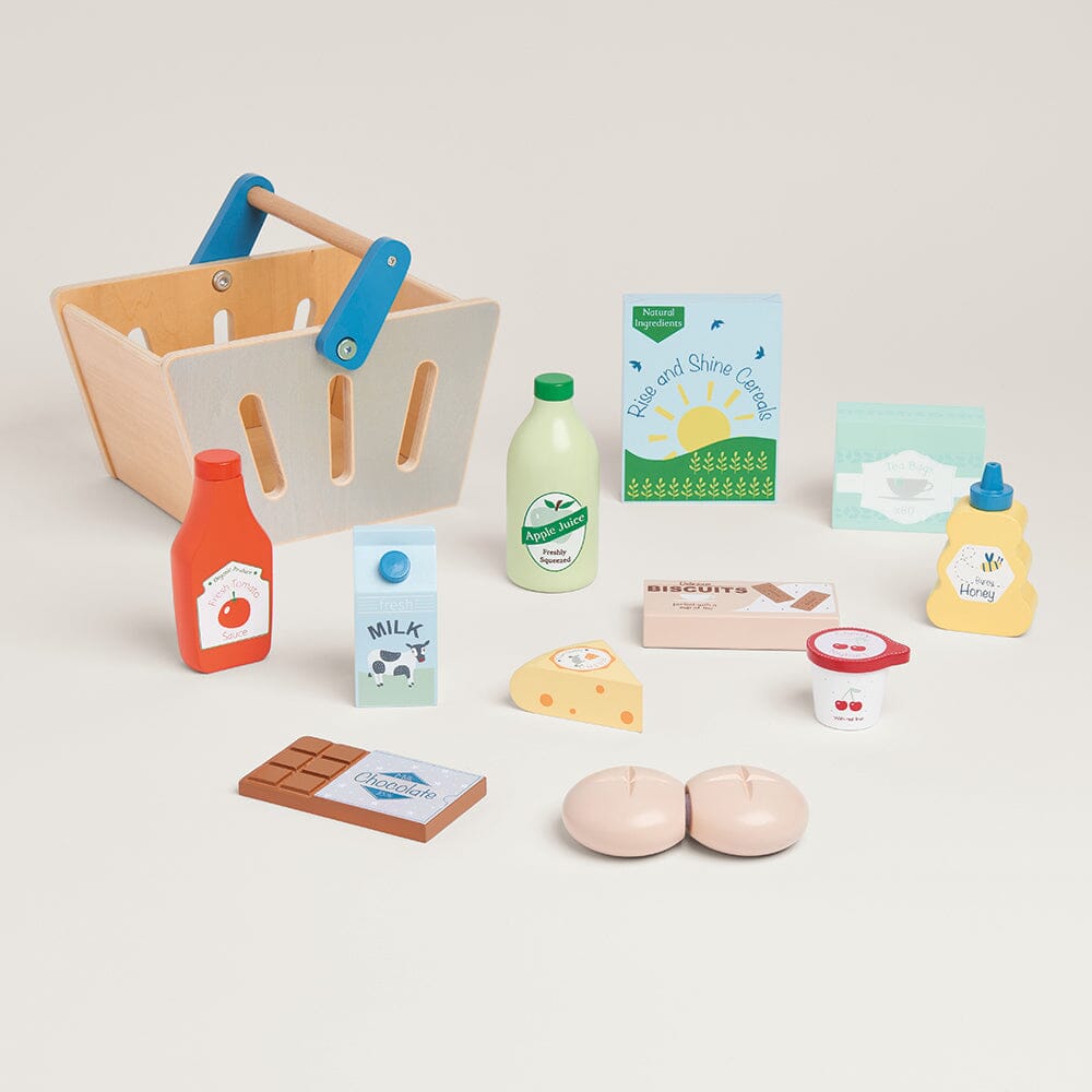 Get set for a shopping spree! This charming toy grocery set is packed with 12 accessories including cereal, apple juice, milk, chocolate, honey, buns, tomato ketchup, cheese, yoghurt, biscuits and tea bags that all fit in the shopping basket. It's perfect for encouraging pretend play and helping develop communication skills.
