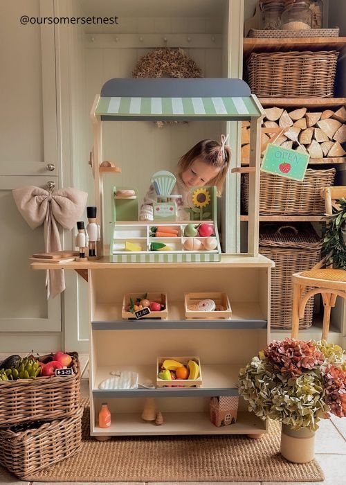 The matching Market Stall is bright and tactile, packed with colourful veg, flowers and farm-shop produce, complete with a handy shopping bag and working scales that add a delightful, realistic touch to every transaction. Both pieces are designed for 360° play, so children can play together from any side and enjoy shared storytelling, turn-taking and role-play.